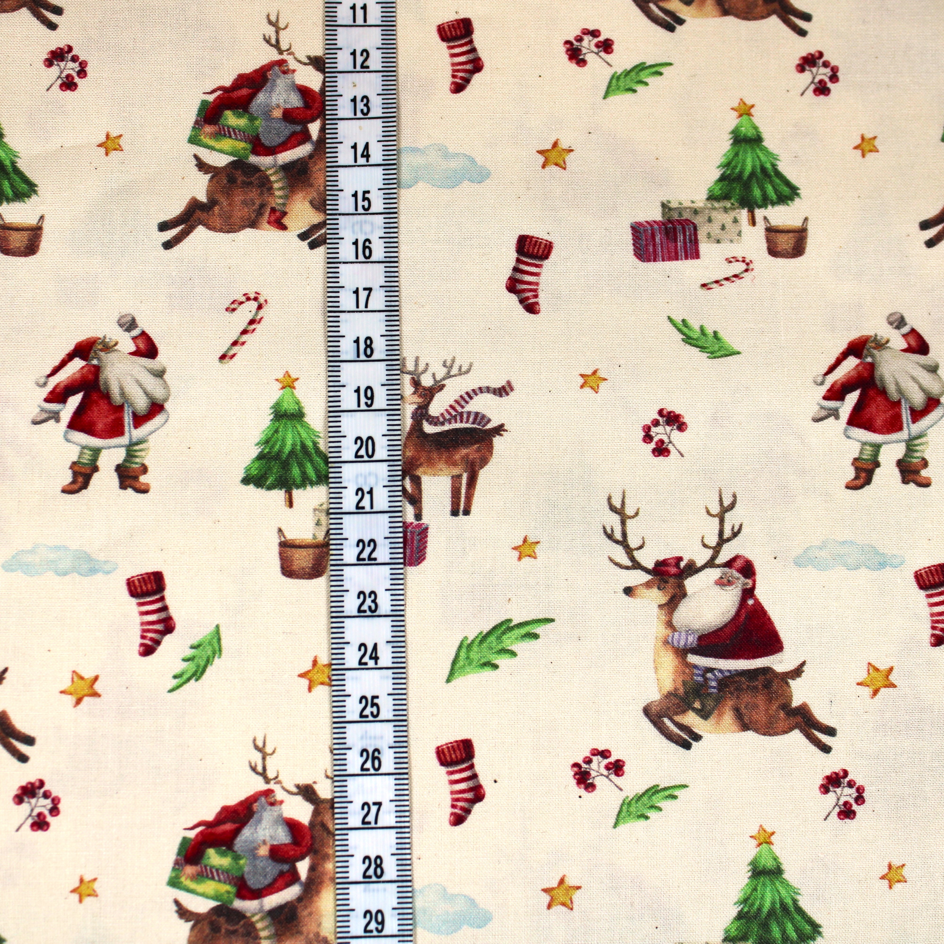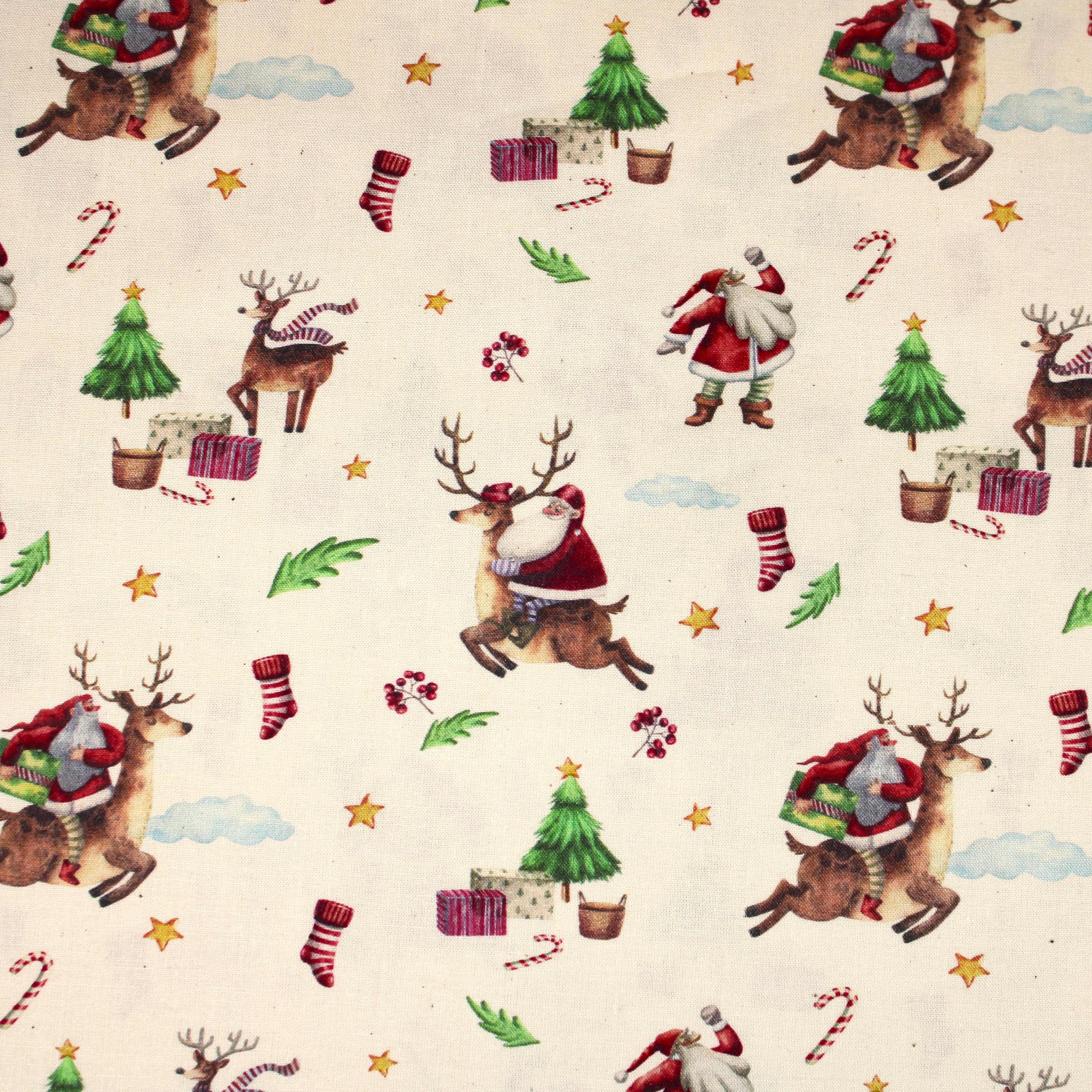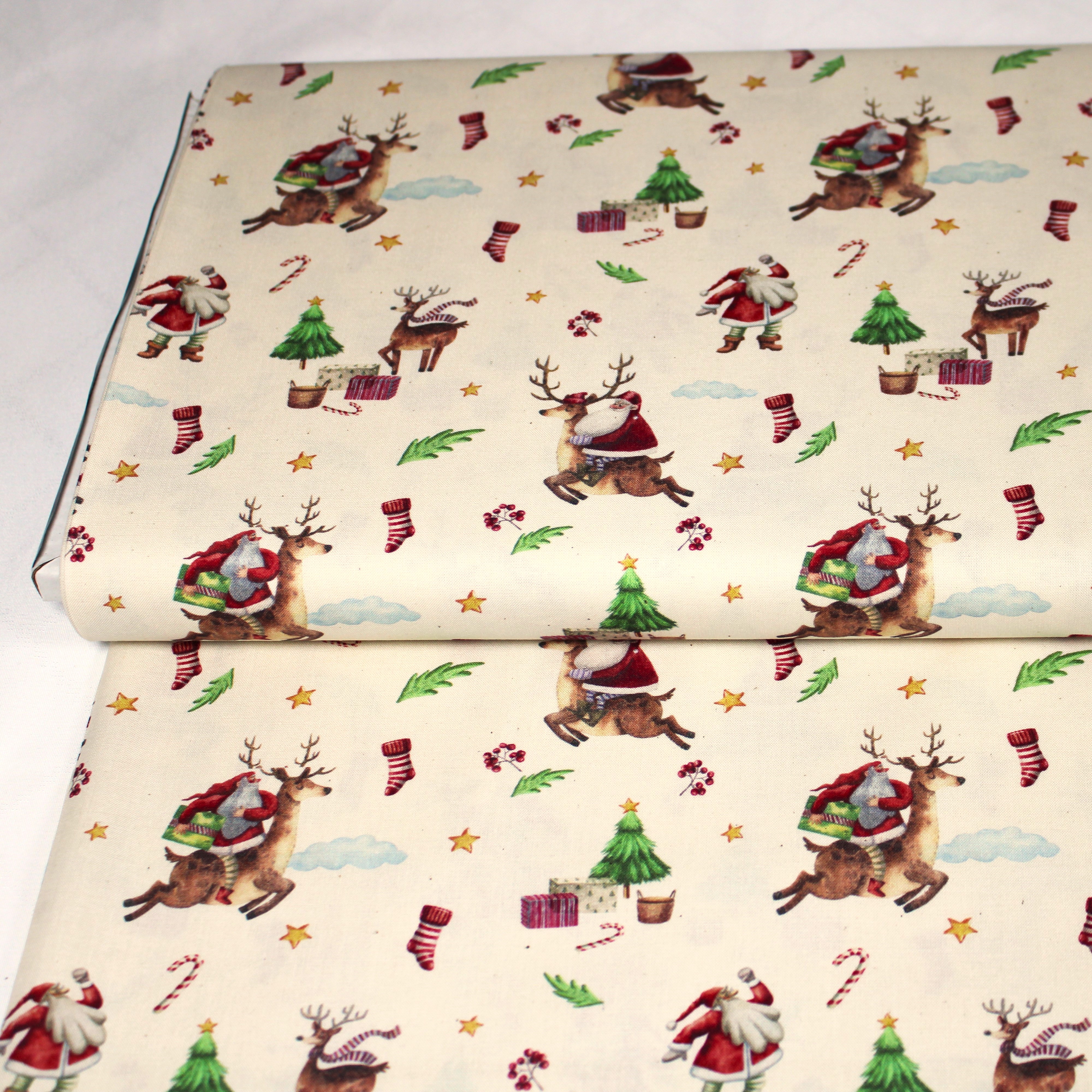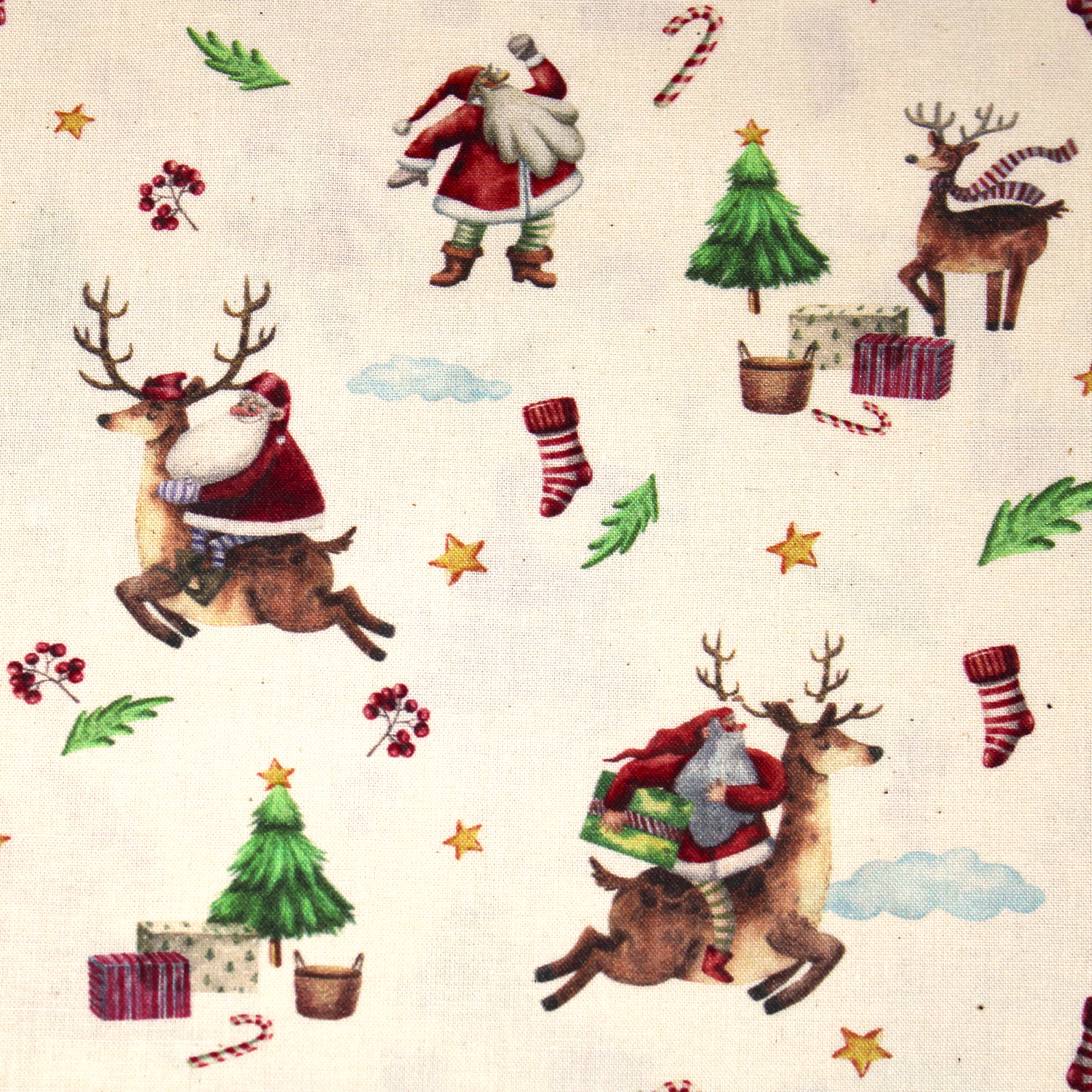 Webware Baumwolle Rentier mit Weihnachtsmann 100% Baumwolle ca. 150cm breit Gewicht: 120g/qm