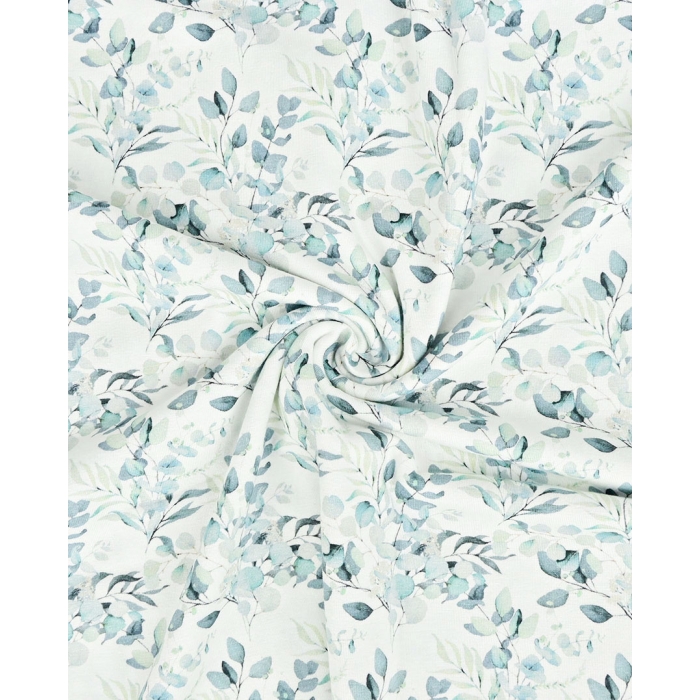 Baumwolljersey mit zartem Eykalyptus in harmonischen mint und grautönen auf naturweiss.