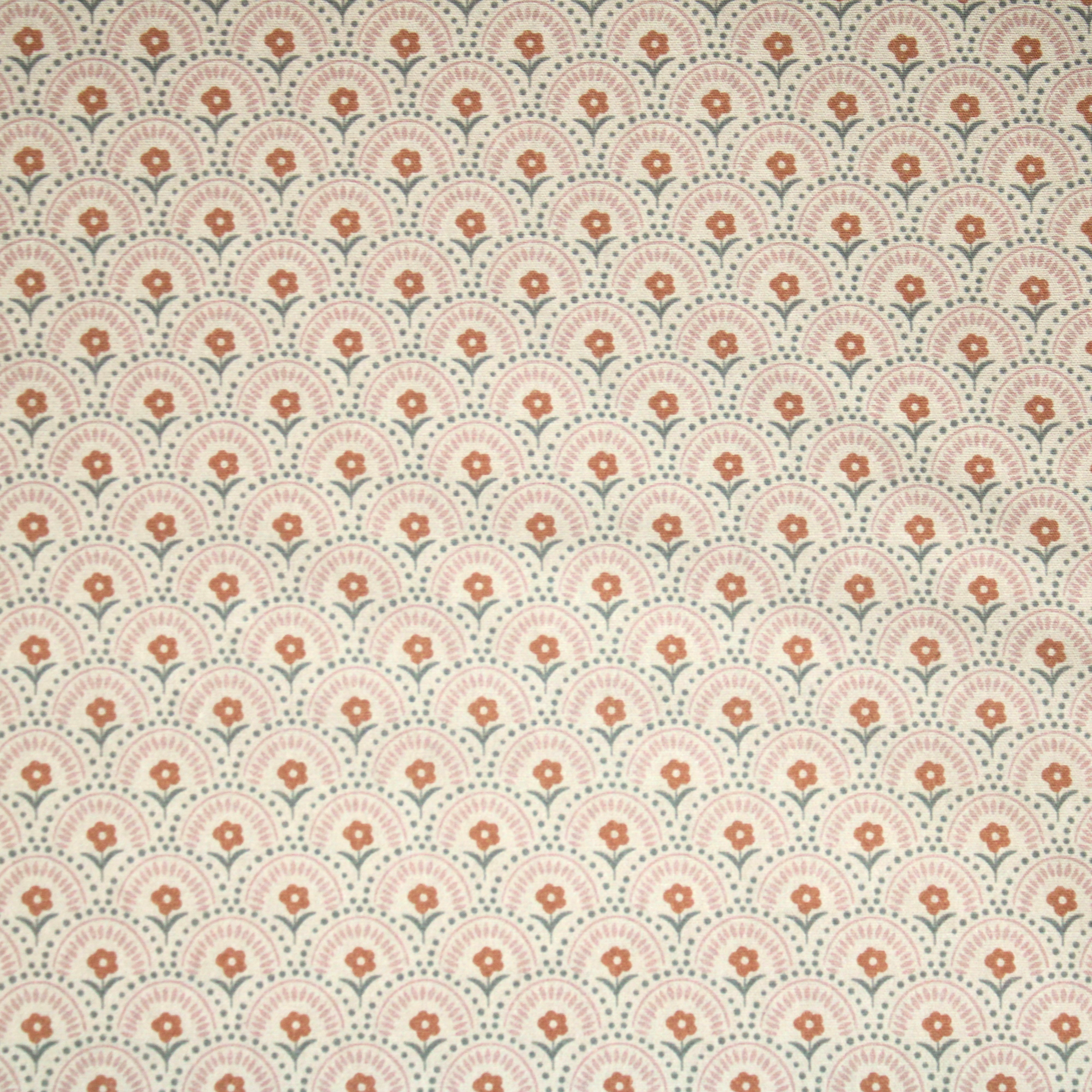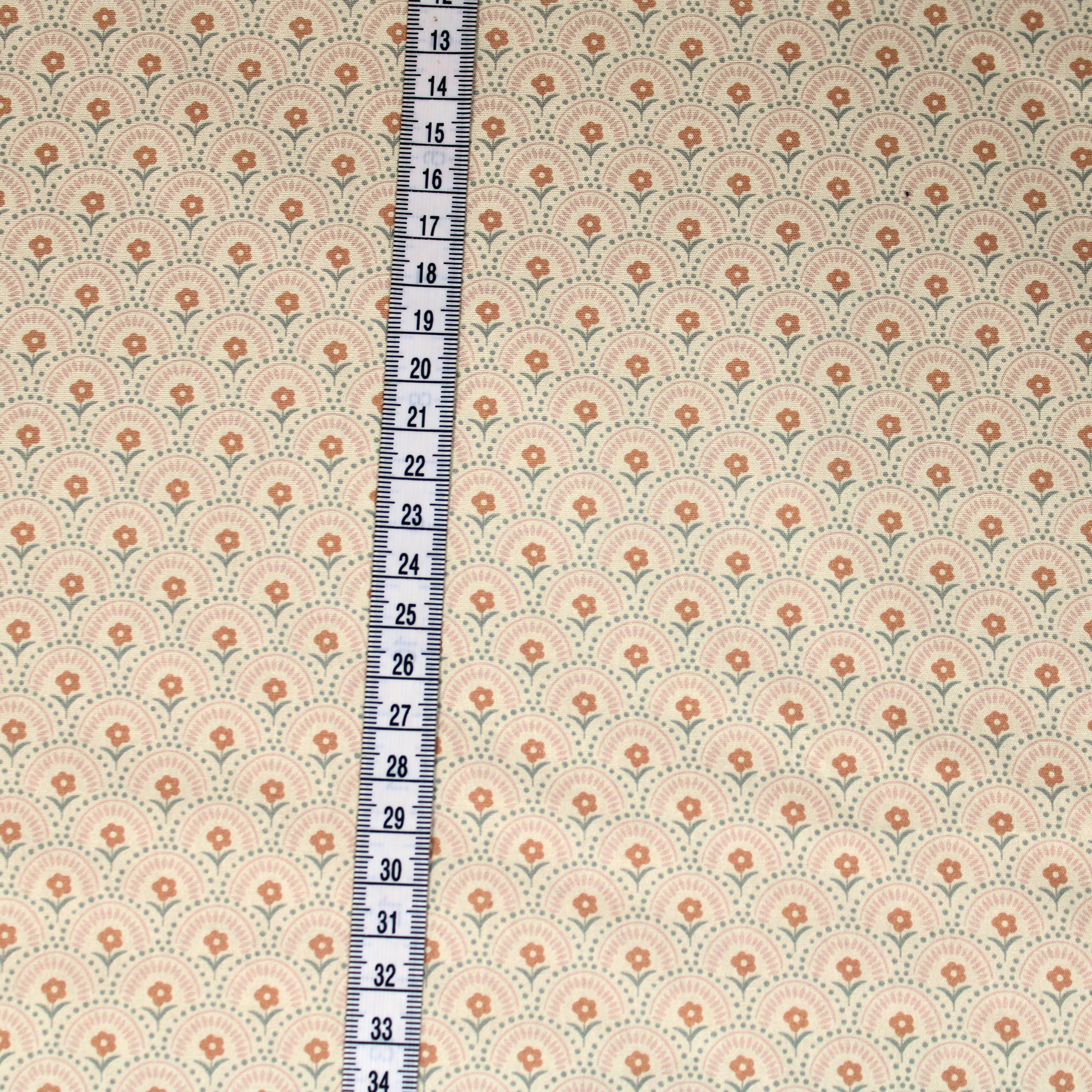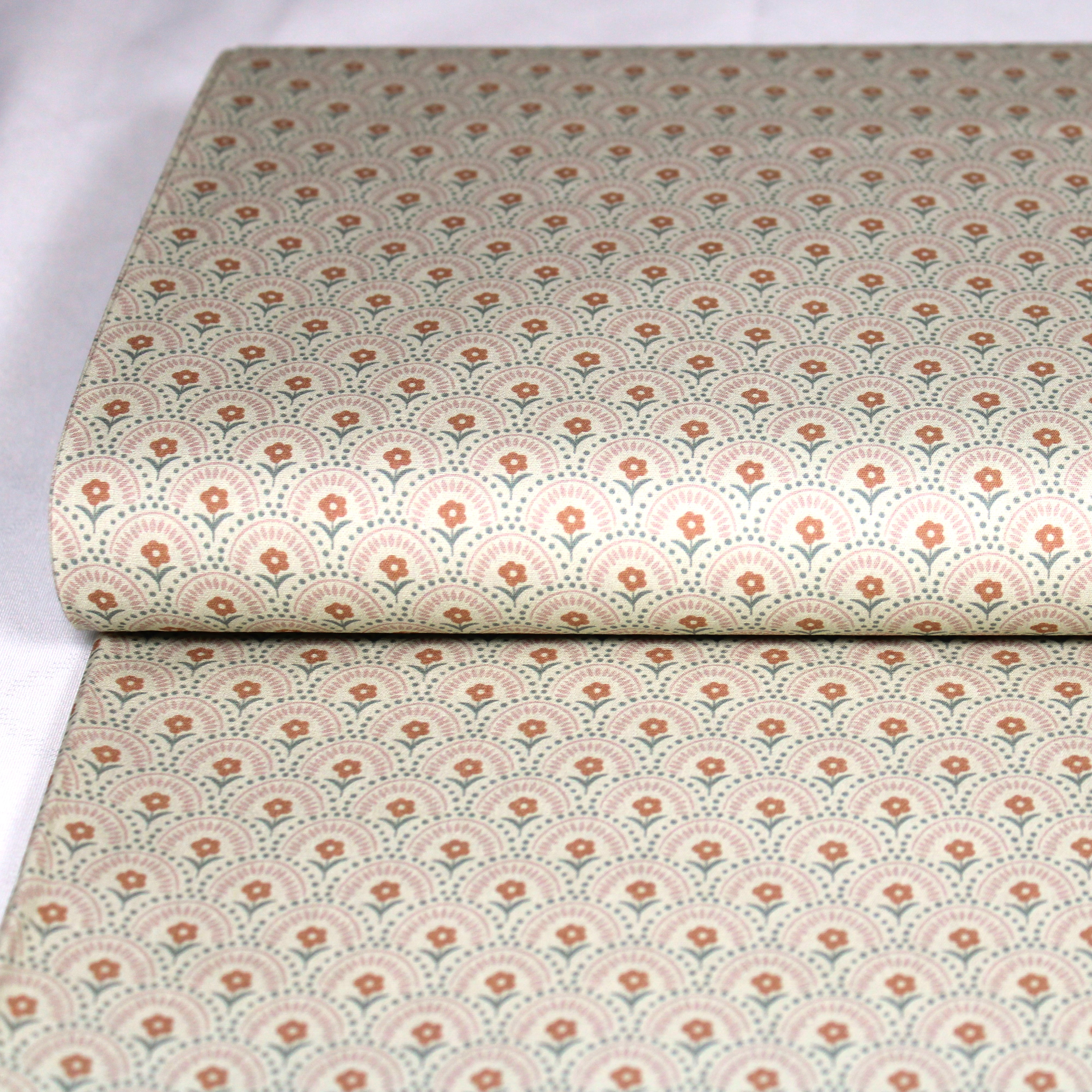 Baumwollstoff mit Art-Deco-Blütenmuster in sanften beige-rose´-Tönen.
