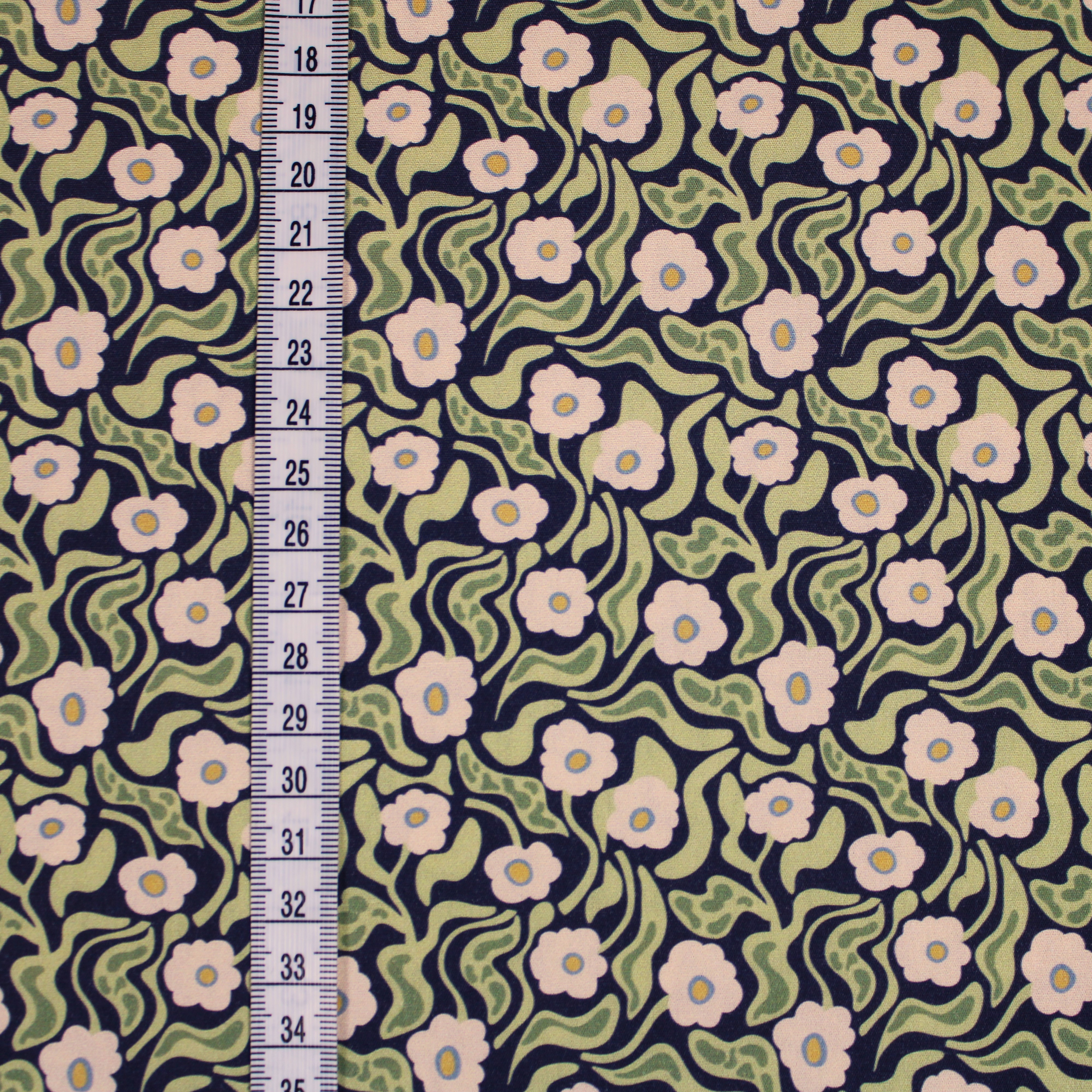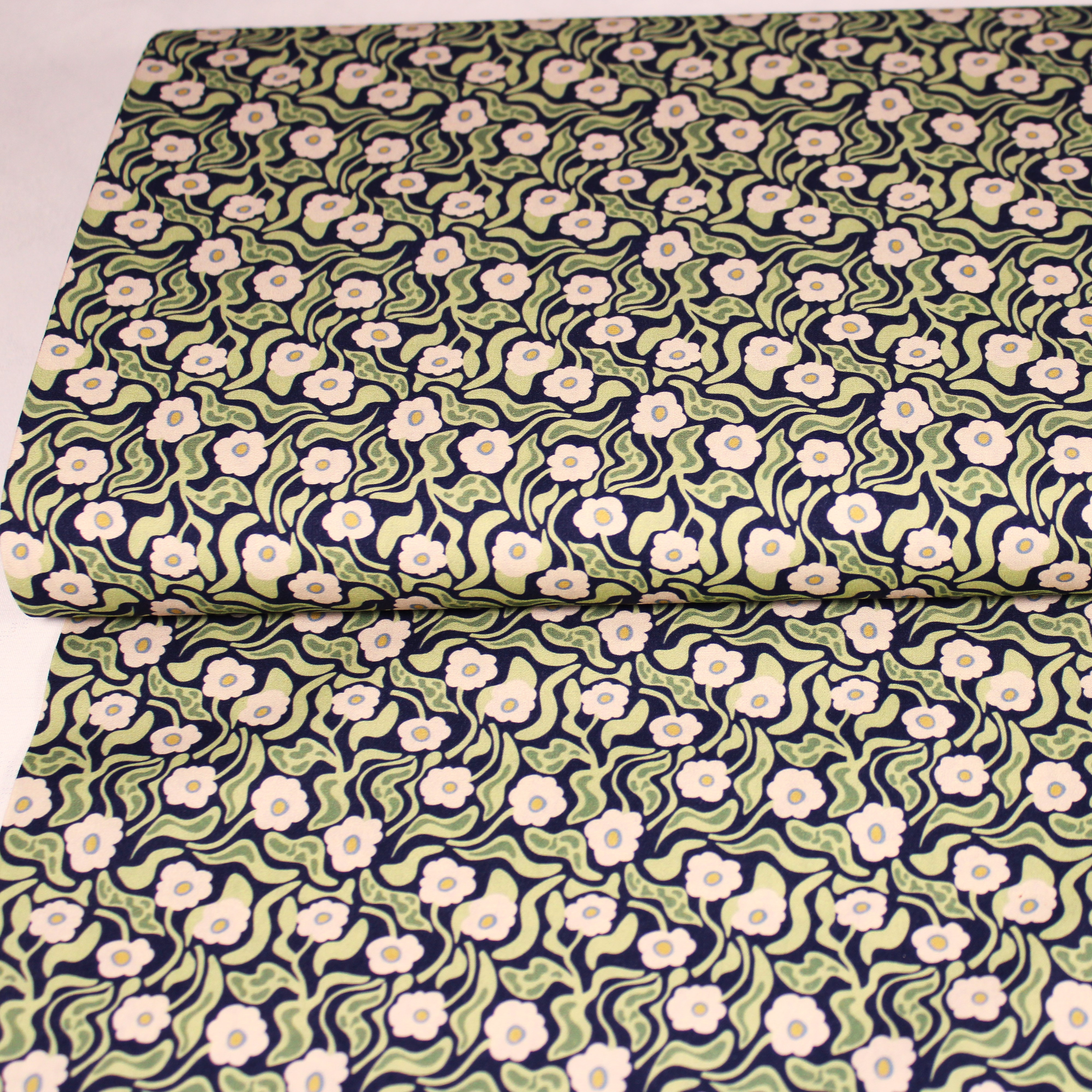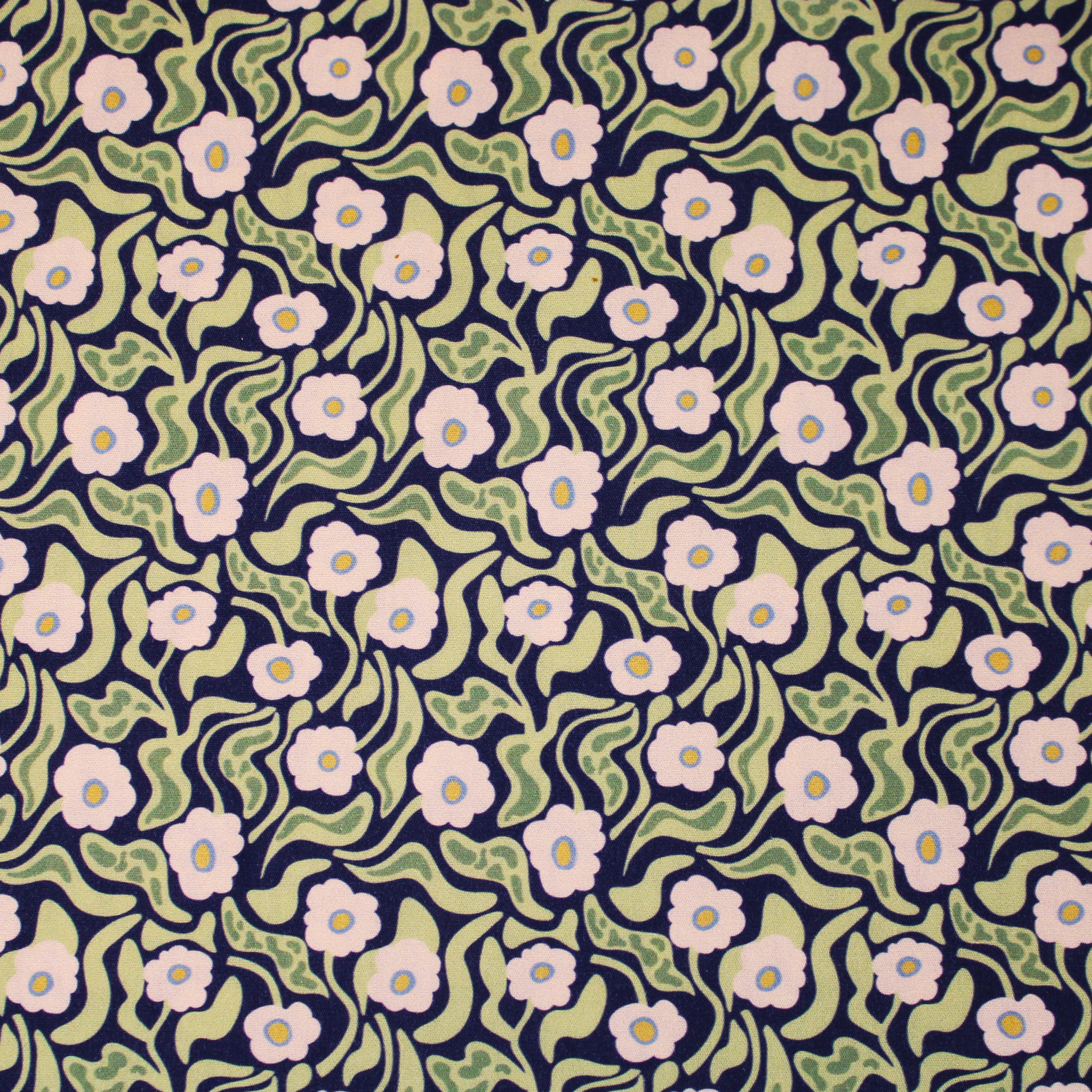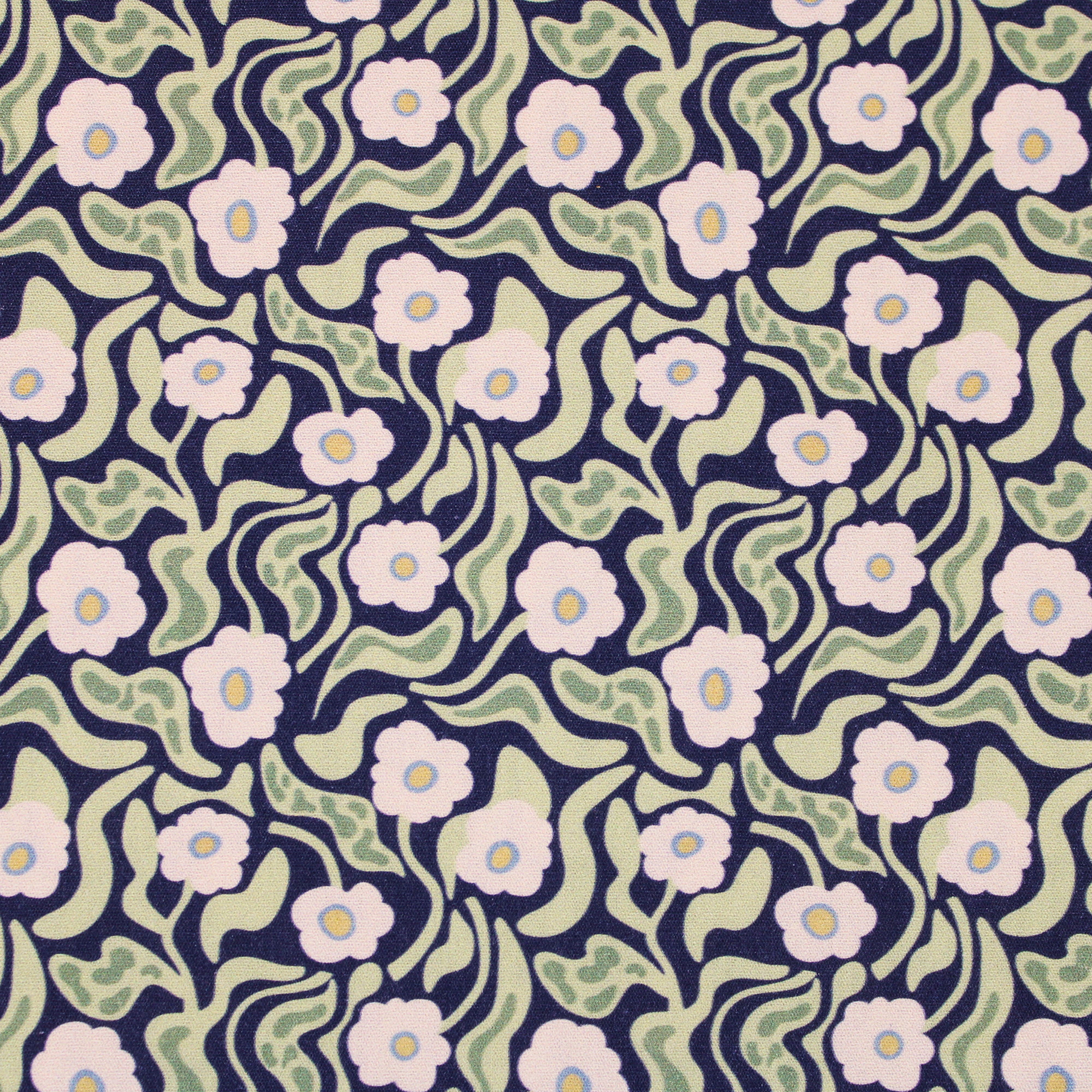 Baumwolle Webware Blumen mit gewellten Blättern auf dunkelblauem Hintergrund 100% Baumwolle ca. 150 cm breit Gewicht: 115g/qm sehr gut geeignet für: Hemden, Blusen, Kleider, Röcke, auch für Deko, Accessoires, Bettwäsche, Vorhänge, Kissenbezüge...