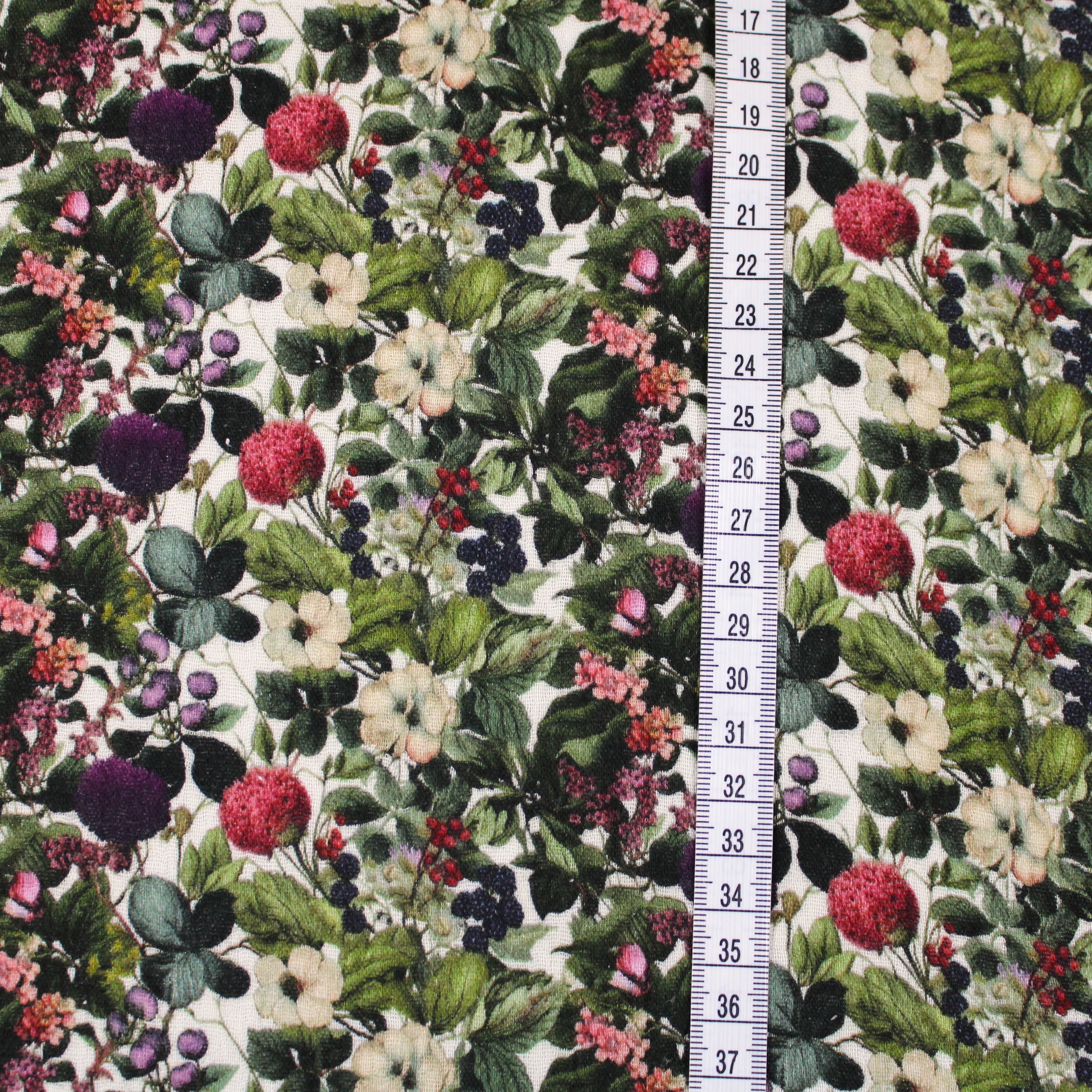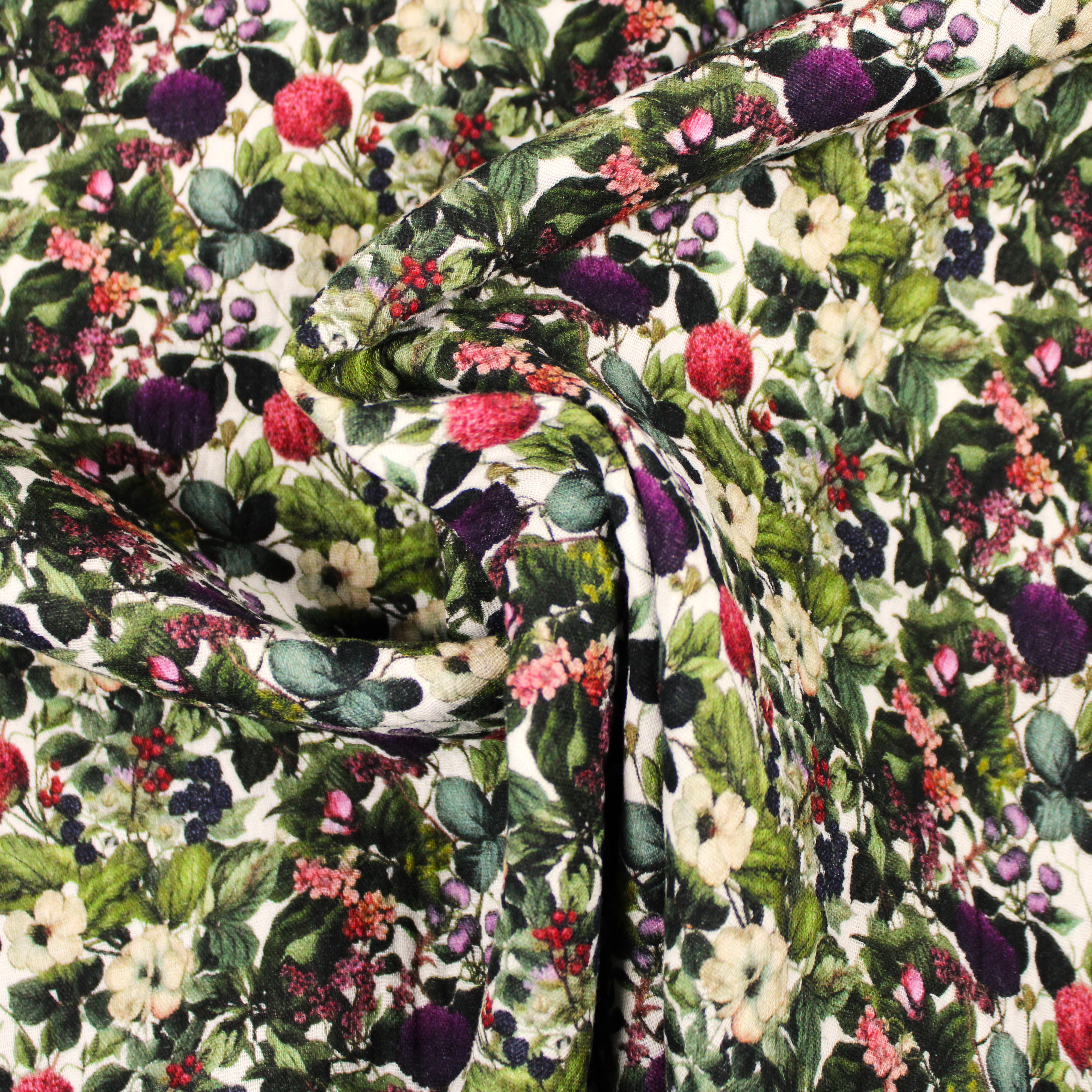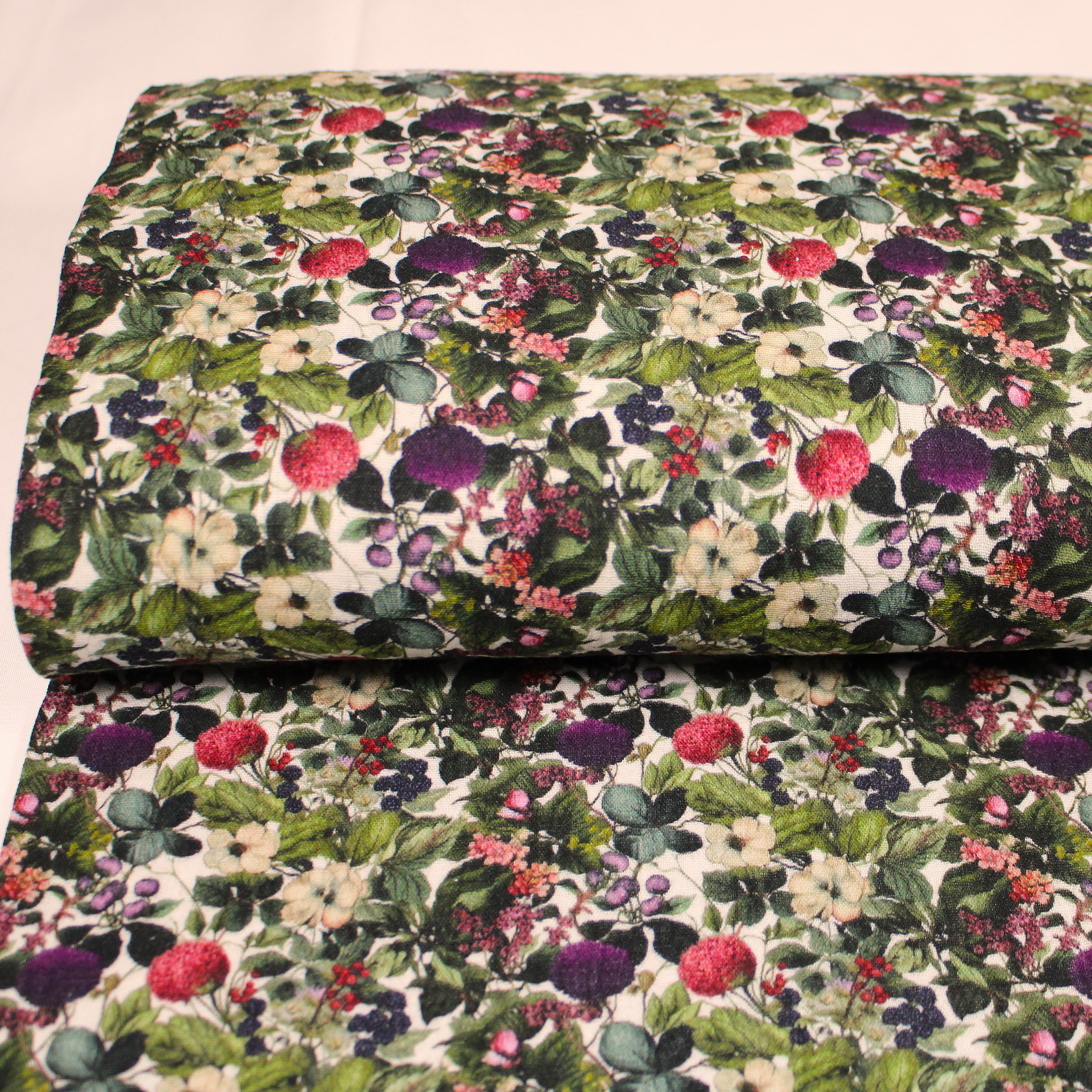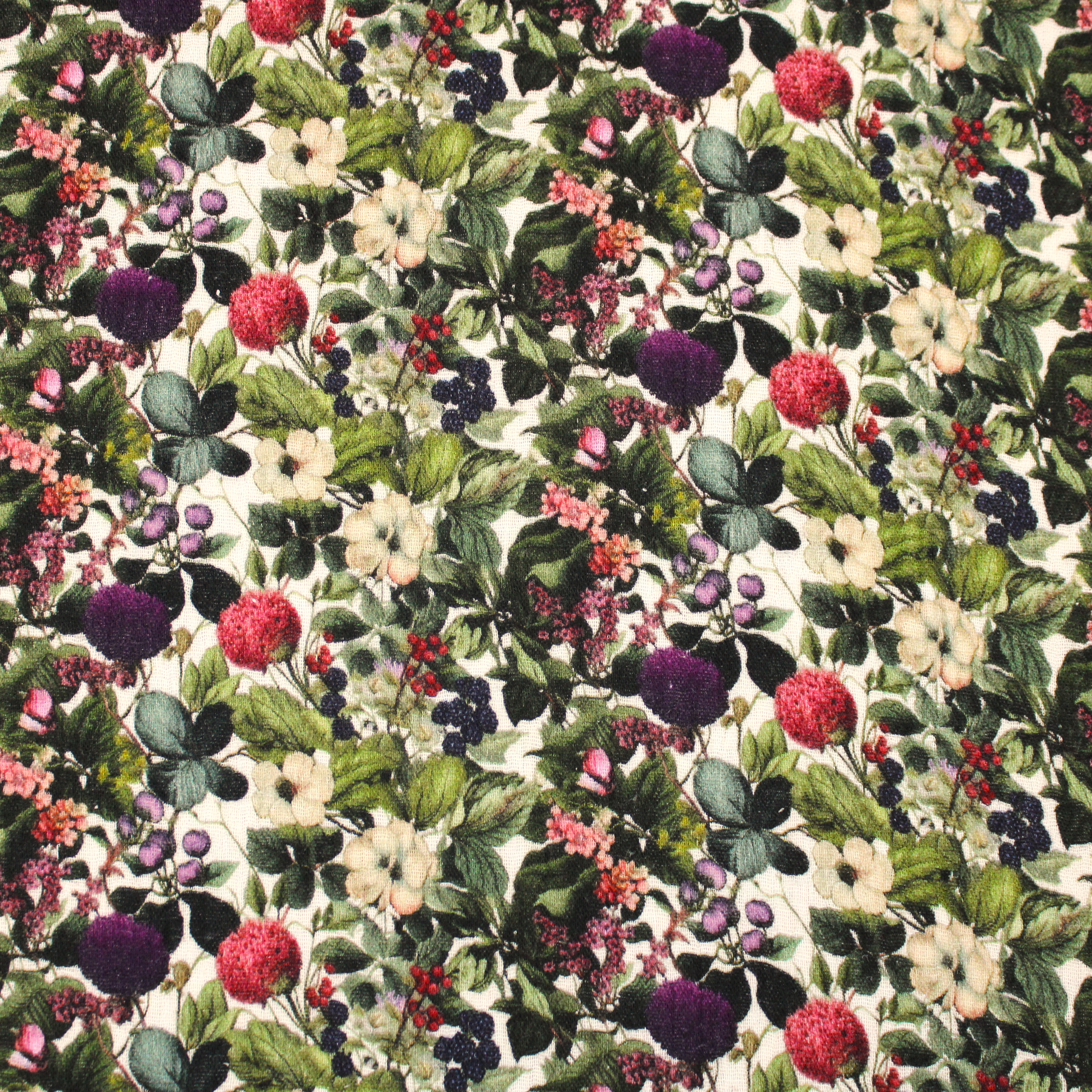 Weicher Musselin mit romatischen Blumen- und Beerenmuster in natürlichen grün und Beeretönen auf hellen Grund.
