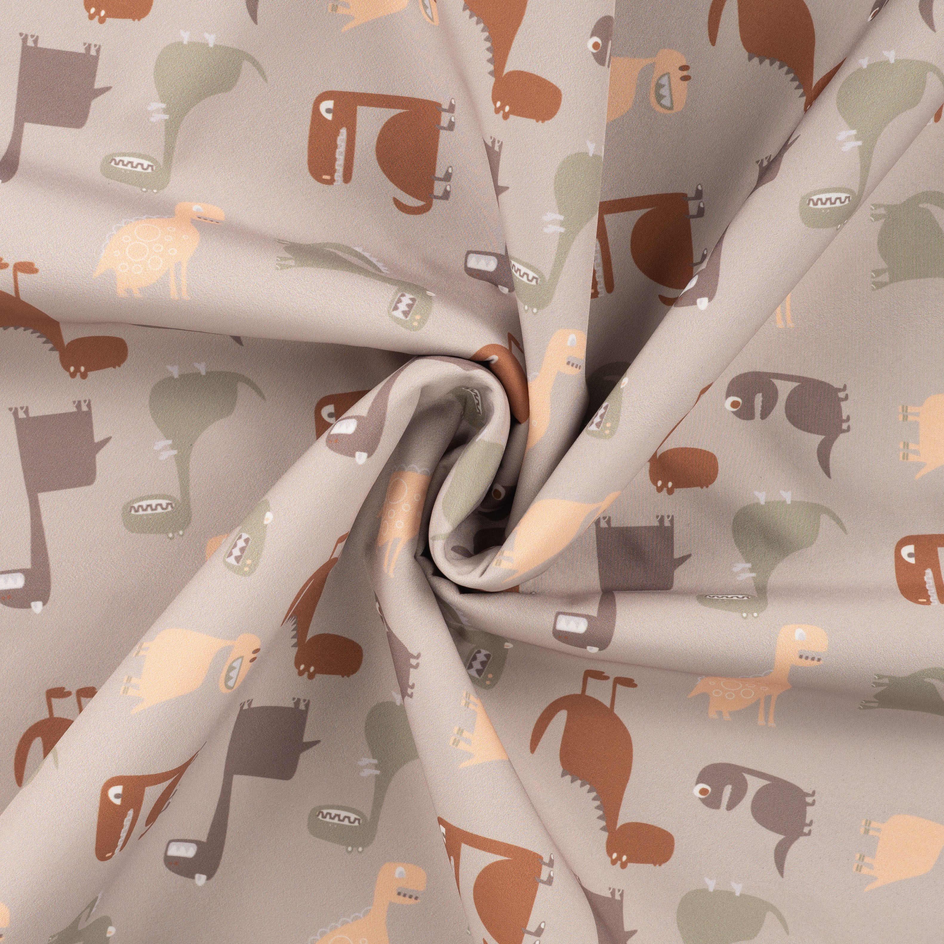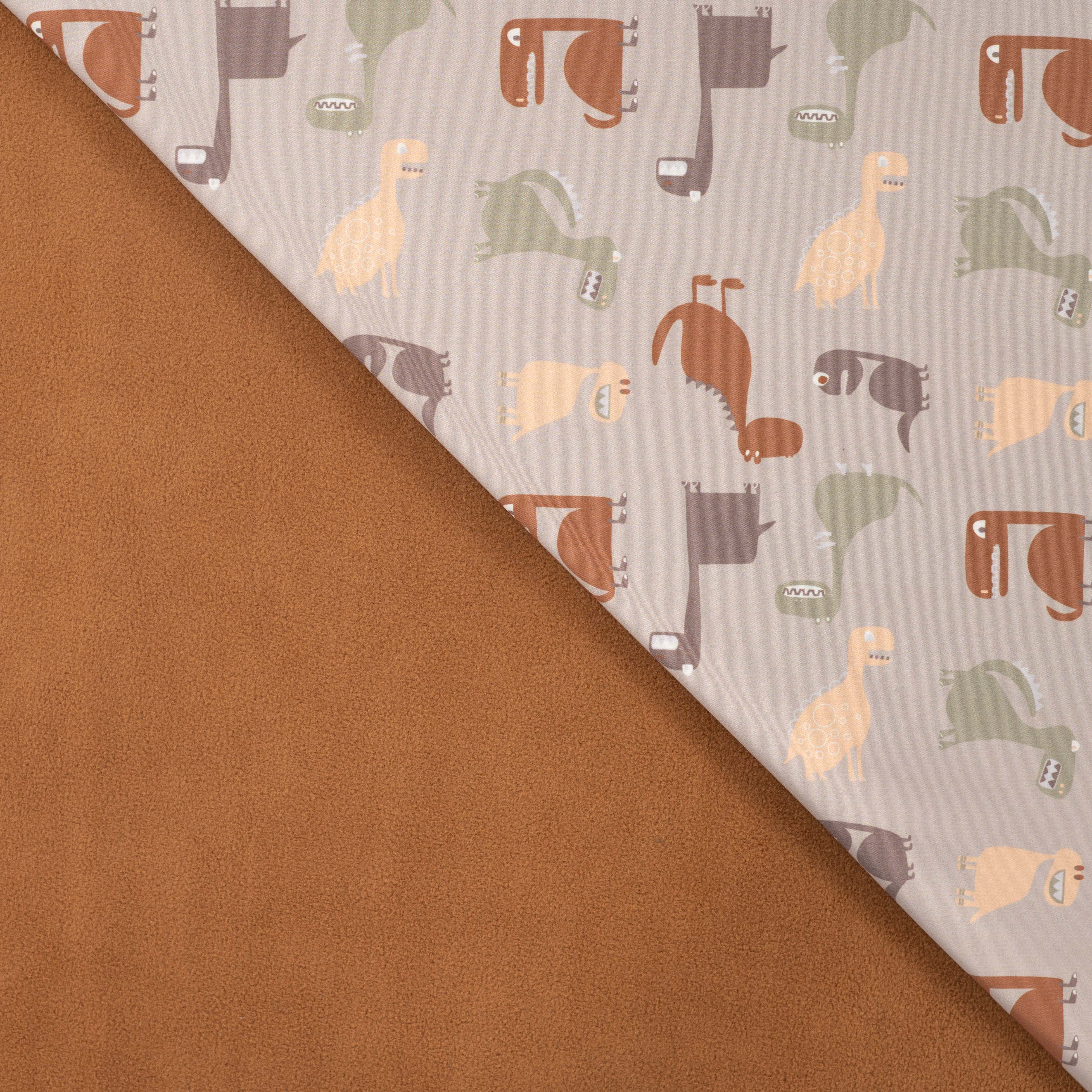 Softshell Dinosaurier auf grau wasserabweisender Softshell mit Fleeceinnenseite für Matschhosen, tolle Jacken oder Rücksäcke und Taschen 99% Polyester, 1% Elasthan, 145 cm breit Gewicht: 310 g/qm